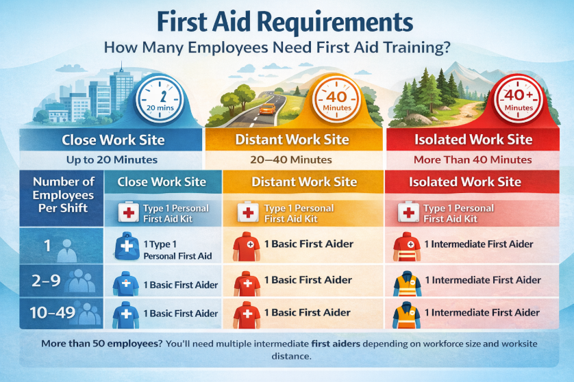 Worksites with 5-9 employees require at least one certified first aider; 20+ require two or more depending on shift patterns.